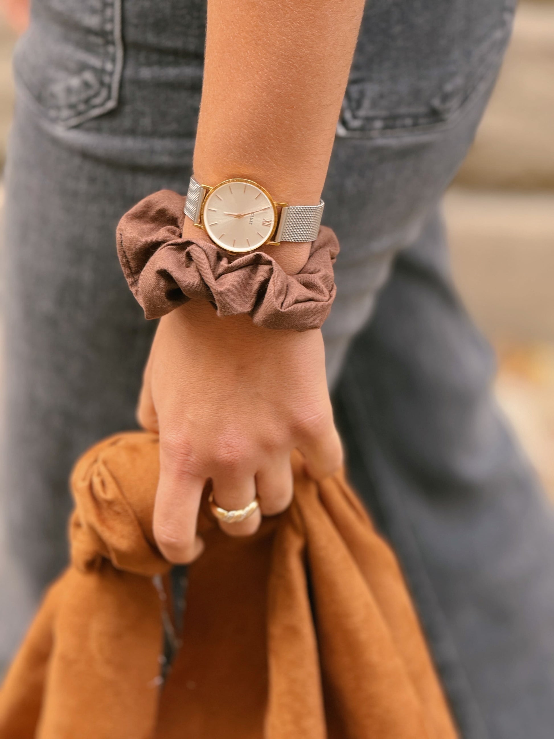C'est LA couleur tendance de la saison ! Apportez chaleur et naturel à vos coiffures avec le chouchou l’Envolée Marron, confectionné en coton doux.