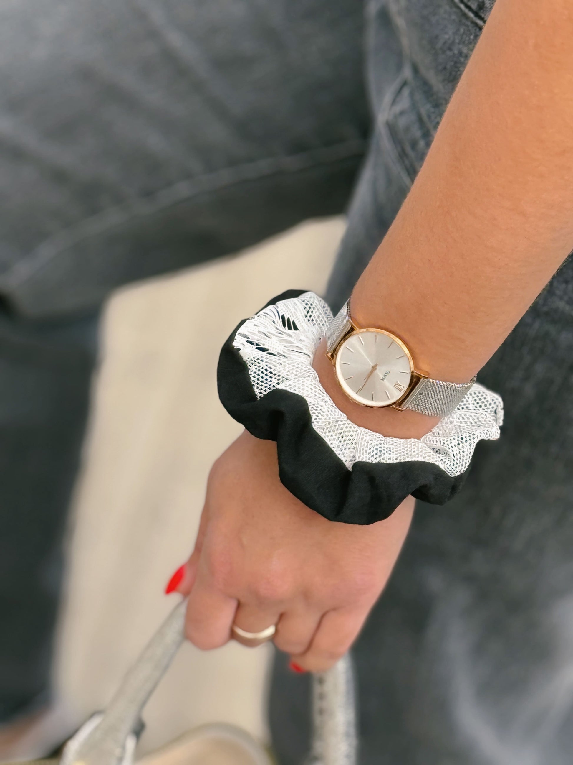 Ce chouchou combine un coton noir et une dentelle blanche pour un style élégant et raffiné. Il est idéal pour une sortie entre fille, ou même une balade en forêt.